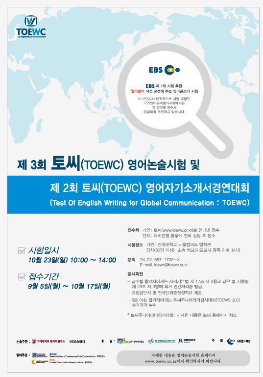 제3회 토씨(TOEWC)영어논술시험 및 제2회 토씨(TOEWC)영어자기소개서경연대회 포스터입니다.